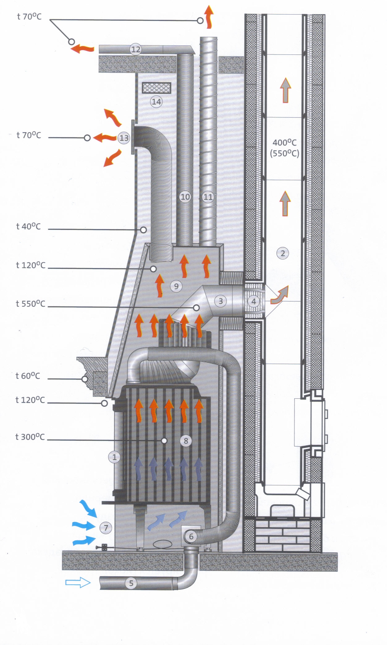 Каминная вставка обеспечивается воздухом для сгорания снаружи здания, поступающим по трубе (5) диаметром 100 мм в поддувало.