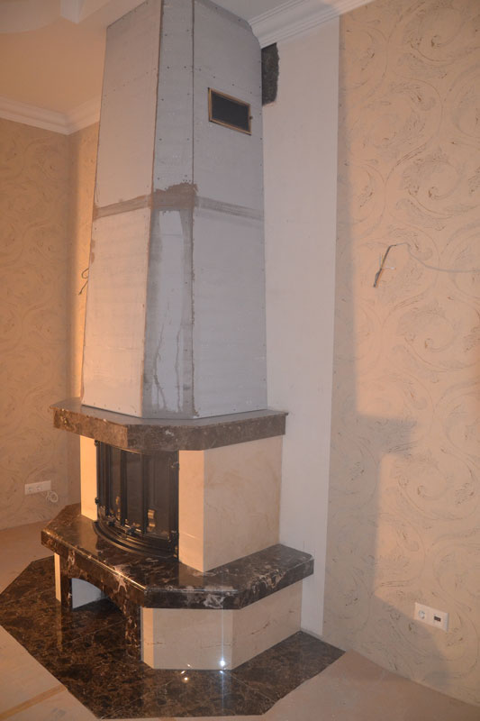 Пристенный камин с использованием норвежской топки Jotul (модель Jotul i18) и мраморной отделкой дарк император. Короб из суперизола.