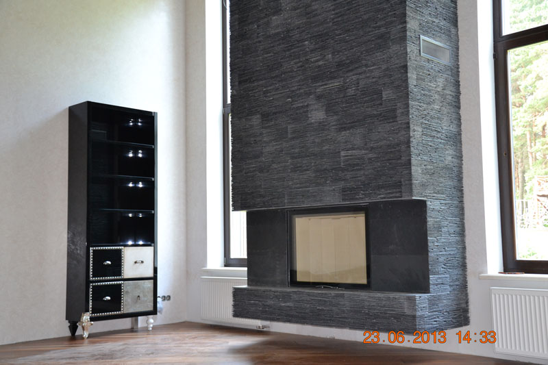 Два пристенный камина с использованием австрийской топки Austroflamm. Один камин отделан плиткой ручной работы и кирпичом ручной формовкой под старину. Для отделки второго использовался натуральный камин. Второй камин интересен еще тем, что он подвесной.