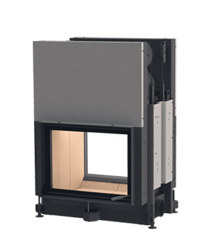 Предлагается каминная топка с двухсторонним стеклом с горизонтальным или вертикальным открытием дверец.