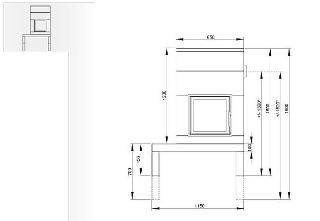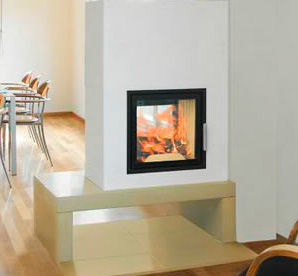 Двухсторонний камин, при использовании которого можно наслаждаться видом на огонь с обеих сторон. Можно заказать модель с прямым или изогнутым патрубком для вытяжки воздуха.