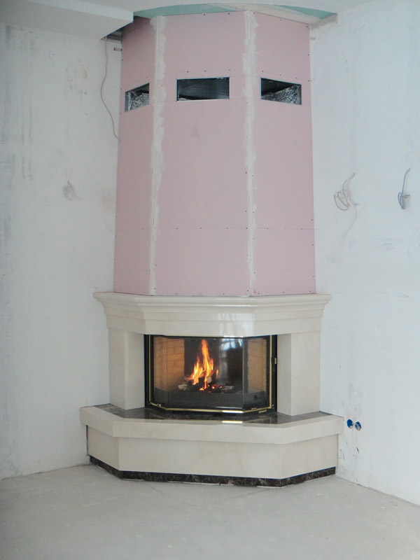 Отделка камина мрамором Крем марфил и Дарк имперадор