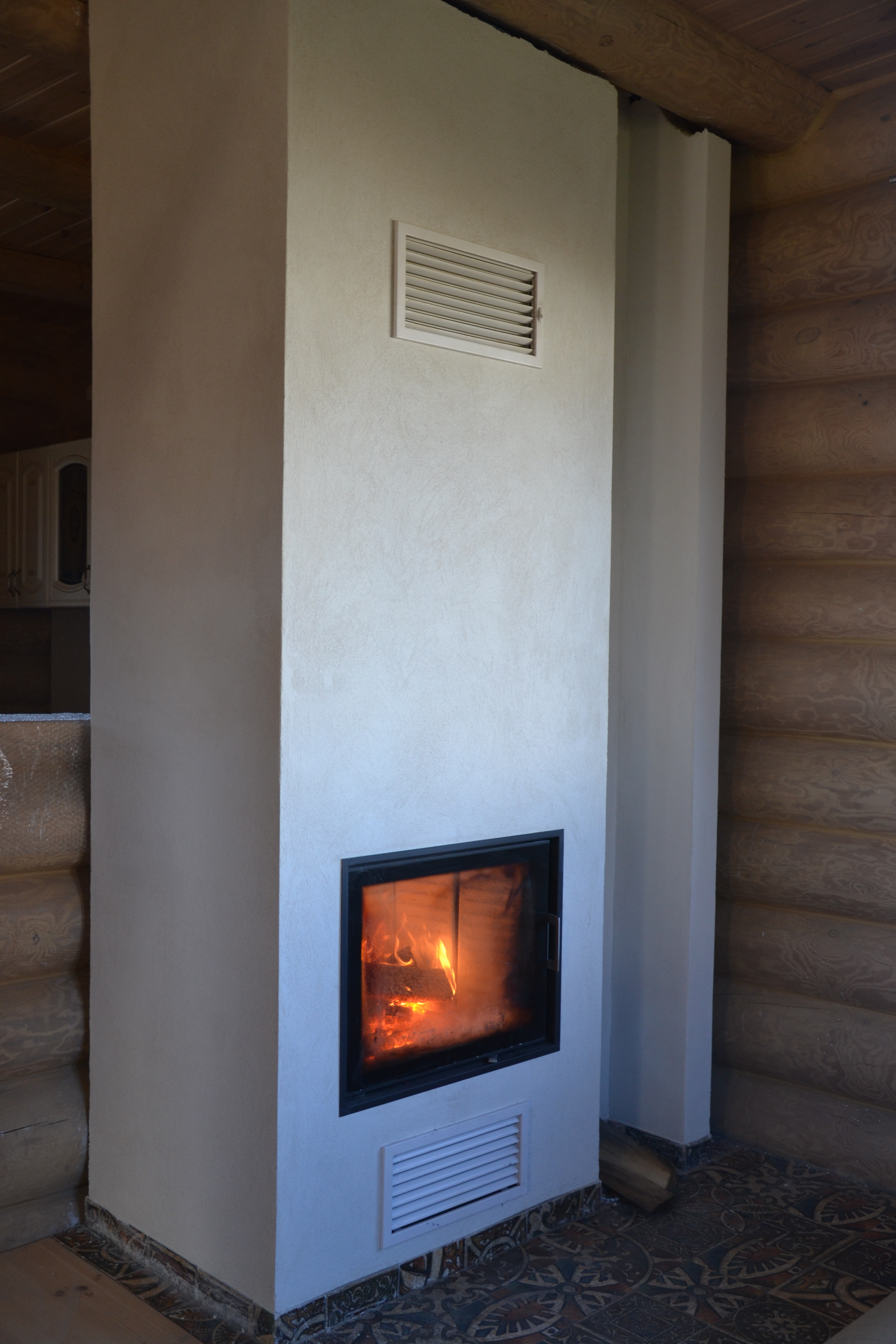 Камин построен из акумуляционных плит и отделан жаростойкими декоративными штукатурками.