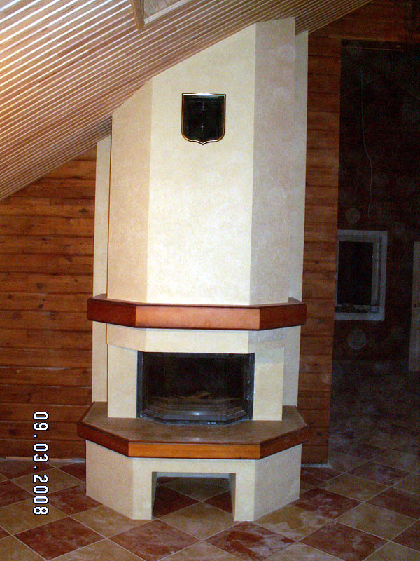 Облицовка: мрамор Gelb, декоративная штукатурка, деревянные наличник и балка